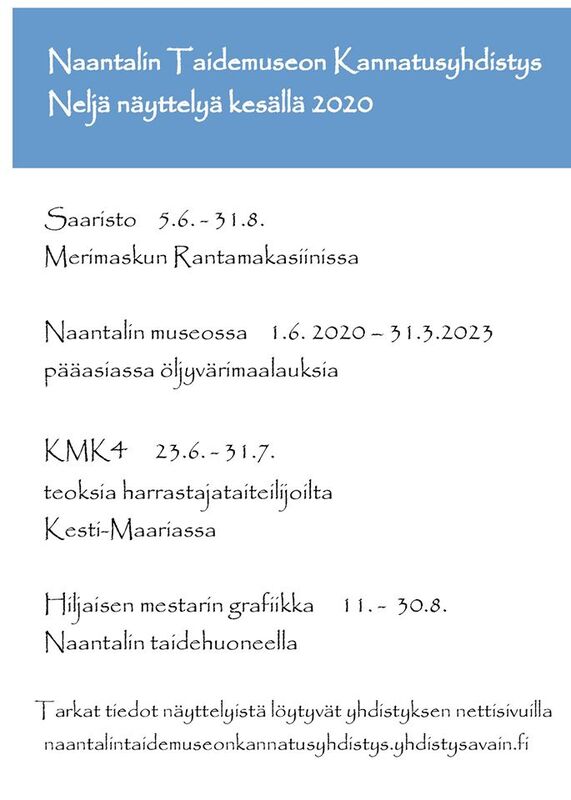 Merimaskun Rantamakasiinissa, Naantalin museossaa, Taidehuoneekka ja Kesti-Maariassa. Kuvassa lisää.