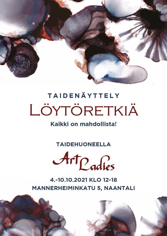 Art Ladies Taidehuoneella 04.10.- 10.10.2021 klo 12 – 18 Naantalin Taidehuoneen näyttelysyksy jatkuu Art Ladiesin omalla näyttelyllä, joka on avoinna 04.10.- 10.10.2021 klo 12 – 18. Vapaa pääsy.
