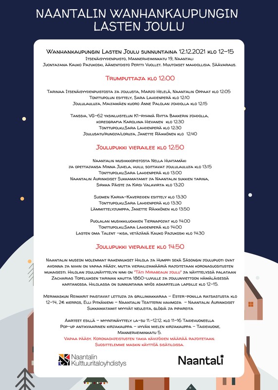 Perinteinen tapahtuma Itsenäisyydenpuistossa Mannerheiminkadulla Itsenäisyydenpuistossa Mannerheiminkadulla jouluista ohjelmaa lapsille ja lapsenmielisille juontajana Kauko Pajukoski. Satua, tanssia, tonttupolku, poniajelua ym. ja tietysti joulupukki. Ohjelma alla liitteenä. Naantalin Kulttuuritaloyhdistys ry yhteistyössä Naantalin kaupungin kulttuuritoimen kanssa. Muutokset mahdollisia. Säävaraus. Tilaisuuden aloittaa perinteiseen tapaan Naantalin Kulttuuritaloyhdistyksen trumputtaja ja juontajana toimii Kauko Pajukoski. Ohjelmaa ovat kokoamassa monet Naantalin Kulttuuritaloyhdistyksen yhteistyökumppanit. Naantalin Oppaiden Marjo Helelä kertoo Itsenäisyydenpuistosta ja joulunvieton taustoista, VG-62 tuo esiintymään ison yksinluistelijoiden joukkueen Riitta Bakkerin johdolla. Naantalin musiikkiopistosta Nella Huhtamäki ja hänen huilunsoiton opettajansa Minna Juhela soittavat joululauluja ja Naantalin Aurinkoisten Sukkamatamien Sirkka Päiste ja Kirsi Valavirta kertovat Naantalin sukkien tarinan. Naantalin Teatteri tuo yleisön keskelle jouluun liittyviä hahmoja, ja Sara-tonttu vie lapsia tonttupolulle. Joululauluja esittää Maijamäen kuoro Anne Palolan johdolla ja Suomen Karva-kaverit tulevat tervehtimään yleisöä. Janette Räikkönen lukee jouluisia tarinoita Pienen Kirjapuodin syksyn uutuuskirjoista ja Merimaskun Reimarit paistavat lettuja, ja Puolalan musiikkiluokkien Tiernapojat, lasten oma Talent -kisa vetäjänä Kauko Pajukoski, ratsastus Ester-ponilla klo 12-14 ja joulupukin vierailut kruunaavat tapahtuman. Lunta on myös luvassa leikkeihin pakkassään nyt suosiessa valmisteluja ja välillä Janette Räikkönen vetää yleisölle virkistävän lämmittelyjumpan. Naantalin museon molemmat rakennukset Hiilola ja Humppi sekä Säsongin joulupuoti ovat avoinna ja niihin on vapaa pääsy, mutta vierailijamääriä rajoitetaan koronasuositusten mukaisesti. Hiilolan joulunäyttelyn nimi on "Täti Mirabeaun joulu". Näyttelyssä palataan Zacharias Topeliuksen tarinan kautta 1860-luvulle ja joulunviettoon hämäläisessä kartanossa. Hiilolassa on sunnuntaina myös askartelua lapsille klo 12-15. Lasten Joulun koko ohjelma ohessa.