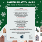 La-su 3.-4.12. Joulumarkkinat Kylpylän edessä ja käsityöntaitajia Amandiksessa klo 11-16. La-su klo 11-15 joulujuna kulkee kylpylästä vanhaankaupunkiin ja torille (maksuton). Sunnuntaina 4.12. klo 12-15 Lasten Joulu Itsenäisyydenpuistossa Mannerheiminkadulla ja joulukirppis vieressä Vanhalla Raatihuoneella klo 11-15, Mannerheiminkatu 14. Myynnissä sekä lapsille että aikuisille second hand -vaatteita ja tavaraa ja jouluisia tuotteita, on lohikeittoa ja tuoretta leipää, satutuokioita ja maksuton askartelupaja lapsille. Myynnissä myös Leena Mattilan ja Pirjo Viitasen kirjaa ”Historiaa ja tarinaa Naantalin Pappilanmäeltä ja sen reunamilta” sekä Vallis Gratiae -yhdistyksen kotiseutuaiheisia kirjoja ja KissMyHoney - hunajaa Livonsaaresta. Museolla sunnuntaina klo 11-15 tonttupolku ja askartelua lapsille. Joulusoitto klo 18 kirkontornista to-su 1.-4.12. Tapani Kiipan joulunäyttely Taidehuoneella la-su 3.-4.12. klo 12-18. LASTEN JOULU 4.12. klo 12-15 Itsenäisyydenpuistossa 12:00 trumputtaja Adrian Ballester 12:00- Sariolan Elämystallin ponitalutusta 12:05 Onnelliset tontut, NVO:n aikuiset ja lapset, Tonttulan 12:15 Huilistien joululauluja, Minna Juhela ja Aava Saarisalo, 12:30 Naantalin Teatterin tontut 13:00 Joulupukki vierailee 13:10 Koiratanssia, Kati Horne 13:30 Puolalan Tiernapojat 13:50 Keppihevosesitys, LiiNa, Leena Haanpää 14:00 Koiratanssia, Kati Horne 14.10 UVKH Dance tanssistudion show, ohjaaja Karoliina Hievanen 14:30 Missä tonttu luuraa, leikkiä Ulla Tuomaksen johdolla 14:40 Joulupukki