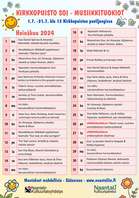 Musiikkia Sirkka Linneasta ja Elvis-gospelista jazziin, vanhaa tanssimusiikkia, harmonikansoittoa, bluesia ja muuta mukavaa musiikkia Naantalin Kirkkopuiston musiikkipaviljongilla. Vapaa pääsy. Säävaraus. pvm esiintyjä ma 1. 7. Duo Daniel Sjöroos & Amanda Männikkö, letkeää kevyttä musiikkia niin nykypäivän tuotannosta kuin takavuosiltakin ti 2. 7. Musiikkikoulu Mäkikalli oppilaineen teemalla "Elämäni laulu" ke 3. 7. Moonshine Duo, Ari Ainasoja, öljykannu-ukulele ja Sakari Kivinen, dobro to 4. 7. Naantalin Harmonikkakerho Toni Perttulan johdolla pe 5. 7. Sami Nieminen & Markku Ahlstrand, hurmurikanttori ja kirkkoherra Elvis-gospelin parissa la 6. 7. Tiikerin vuosi, nuorten ammattilaisten kaihorockbändin soundi on sekoitus suomirockin kuusenkerkkiä ja countrypölyä Amerikan valtateiltä su 7. 7. Semites ja Tiina Uutela, tanssimusiikkia laidasta laitaan ma 8. 7. Iris Valin, kansainvälinen harmonikkataituri ti 9. 7. Kelpo Duo, Aleksi Wirkberg, Kauko Hyvärinen, vanhempaa tanssimusiikkia ja iskelmää ke 10. 7. Ari Ainasoja, öljykannu-ukulele, Roots & Blues to 11. 7. Musiikkikoulu Mäkikalli oppilaineen teemalla "Kun taas on aika auringon" pe 12. 7. Trio Topi Luoma, kevyttä ja reipasta rokista valssiin, Vesa Ranki, koskettimet ja laulu, Jari Anttila, bassokitara ja laulu, Matti Ylevä, rummut ja laulu la 13. 7. Sun City Blues, bluesin klassikoita ja omia biisejä, Harri Laakso, laulu ja kitara, Ilkka Reima, soolokitara, Pekka Korhonen, basso ja Kimmo Lilja, rummut su 14. 7. Duo Jere Vilkkinen, laulu ja kitara, Elina Ukkonen, koskettimet, kesäistä iskelmämusiikkia ma 15. 7. Iris Valin, kansainvälinen harmonikkataituri ti 16. 7. Naantalin Pelimannit Toni Perttulan johdolla ke 17. 7. Moonshine Duo, Ari Ainasoja, öljykannu-ukulele ja Sakari Kivinen, dobro to 18. 7. Matti Mäntylä, laulu & Jukka Miikkulainen, kitara pe 19. 7. Prinssi Rohkea ja Erämaan Rotat la 20. 7. Tanssimusiikkiduo Daniel Sjöroos ja Seppo Mäkikalli su 21. 7. Duo Terhi Jokila, laulu ja Elina Ukkonen, koskettimet, kesäistä iskelmämusiikkia ma 22. 7. Iris Valin, kansainvälinen harmonikkataituri ti 23. 7. Sami Nieminen, Hurmurikanttori, rakkauslauluja ja iskelmää ke 24. 7. Ari Ainasoja, öljykannu-ukulele, Country & Blues to 25. 7. Kalle Niittynen & Veikka Kajamies Duo, saksofonisti Kalle Niittynen ja pianisti Veikka Kajamies hyppäävät jazzin pyörteisiin herättäen henkiin liudan parhaita jazz-standardeja pe 26. 7. Tiikerin vuosi unikeon lavalla, nuorten ammattilaisten kaihorockbändin soundi on sekoitus suomirockin kuusenkerkkiä ja countrypölyä Amerikan valtateiltä la 27. 7. unikeonpäivän ohjelmaa unikeon lavalla su 28. 7. Sandria Haapala & Veikka Kajamies Duo, laulaja Sandria Haapala ja pianisti Veikka Kajamies yhdistävät voimansa vieden kuulijansa viihdyttävän inspiroivalle matkalle parhaiden jazz- ja soul-biisien maailmaan. Vallis Gratiae -yhdistyksen kanssa yhteistyössä ma 29. 7. Iris Valin, kansainvälinen harmonikkataituri ti 30. 7. Poikonen Viitanen Revival, vaakunnan parasta kotimaista rytmimusiikkia kolmen solistin voimin. Jaska Poikonen - laulu ja kitarat, Kotton Viitanen - laulu ja basso, Olli Toivonen - laulu, kitara ja kosketinsoittimet, Heikki Räisänen - rummut ke 31. 7. Tanssiorkesteri Extreme Liitteet