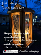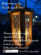 Naantalin Kulttuuritaloyhdistys toivottaa joulurauhaa ja iloa! Vuosi on ollut työntäyteinen, mutta myös juhlavuoden ja iloisten uutisten sävyttämä. Kiitos kuuluu kaikille upeille vapaaehtoisille, jotka olette olleet mukana vaikuttamassa toimintaamme ja osallistumassa kulttuuritapahtumien tuotantoon. Kiitos kuuluu myös rakkaille yhteistyökumppaneille, jotka olette tukeneet meitä naantalilaisen kulttuurin parissa toimiessamme. Tervetuloa myös toimintaan tulevana vuonna: uusia ideoita, tapahtumia, työpajoja, kursseja...Raatihuoneelle sopii monenlaista toimintaa unohtamatta tuttua Taidehuonetta. Raatihuoneen piha tarjoaa myös mahdollisuuksia tapahtumatoimintaan. Tule ideoimaan ja toteuttamaan! Ota yhteyttä leena.salo@outlook.com tai soita 0400528357/Leena Salo. |