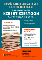 Lahjoita kirjasi Tuhkamarkkinoiden Kirjat kiertoon -kirja-antikvaaria varten ke 25.2. Raatihuoneella, Mannerheiminkatu 14. Kirjojen vastaanottoaika on alkaa klo 16:30 ja päättyy klo 18:30. Turun Kulttuuritaloyhdistys ry ottaa vastaan hyväkuntoisia kirjoja Tuhkamarkkinoiden kirja-antikvaaria varten.