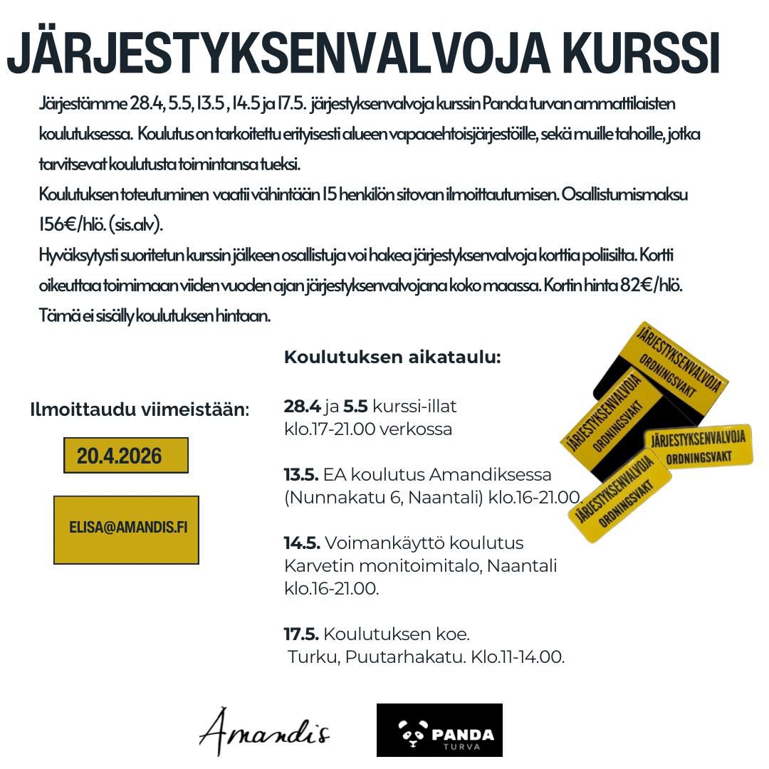 Naantalin Kulttuuritaloyhdistys tarjoaa jäsenilleen mahdollisuuden osallistua järjestyksenvalvojakoulutukseen Panda Turvan koulutuksessa keväällä 2026.