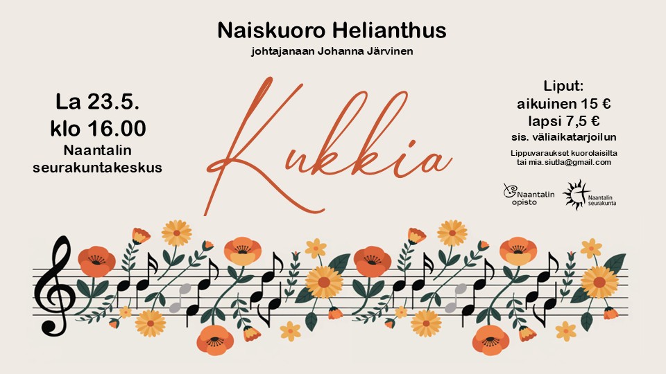 Naiskuoro Helianthus esittää Kukkia-kevätkonserttinsa Naantalissa lauantaina 23.5. klo 16. Tapahtumapaikkana on Naantalin seurakuntakeskus. Kuoronjohtajana toimii Johanna Järvinen. Liput 15 € / 7,5 € sisältävät väliaikatarjoulun.